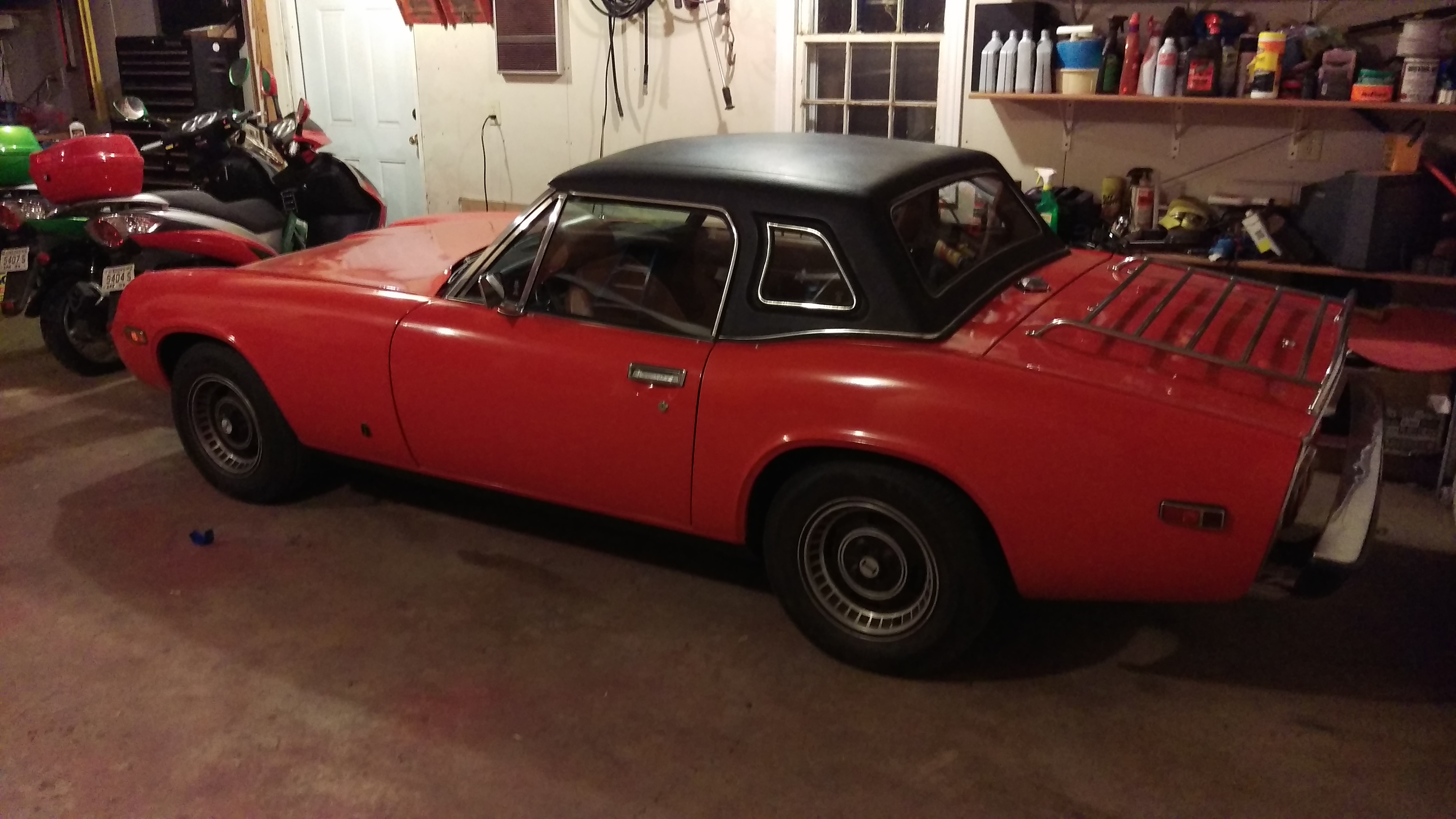 I decided to go ahead with something I’ve been thinking about since last fall… a couple of weeks ago I made a phone call, drove over to look, and came back with a nice hardtop for her. The guy who had it had originally approached me at a show last fall and asked if I was interested, and I told him that I would think about it. Finally got back to him, he still had it (and was about to put it on eBay) so after a bit of haggling (with me in the drivers seat on the transaction since I was the guy in his driveway with cash and no need to ship this crazy oversize thing) we agreed on a fair price. And the top, while not original (it’s an aftermarket from Custom Hardtops in California) is almost like new. He bought it new with the can back in 1974, it stayed in the garage most of the time, and for whatever reason when he sold the car, the buyer didn’t want the top. Good for me, though. Actually drove her around for a week or so with the top on before I took it off for the summer.
